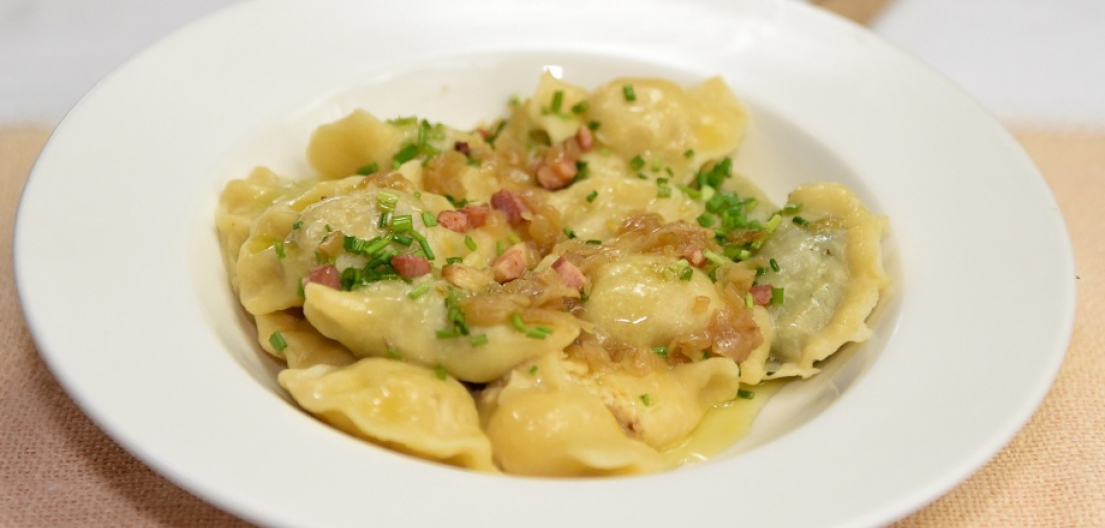 - Traditional Polish pork chop in golden breadcrumbs, baked potatoes with herbs and fried cabbage
